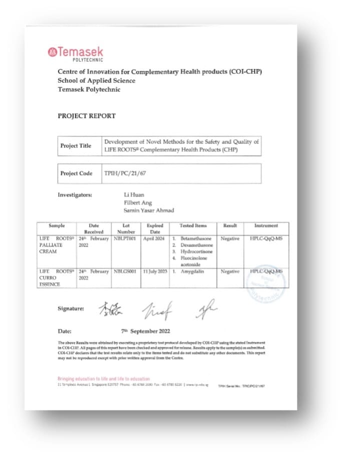 (Palliate & Curro) Safety & Quality test, Palliate free of the 4 most common steroids found in cream products, Curro does not contain Amygdalin:
